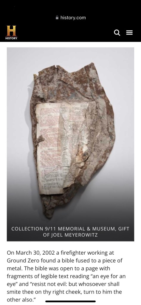 One of the documentations I watched involved collected artifacts such as coins, newspapers, personal belongings of individuals donated in remembrance of loved ones. The museum displays a piece of metal with a page of the Bible fused to it. God is speaking to us.